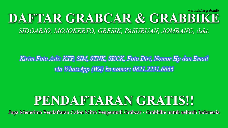 Pada beberapa tulisan sebelumnya, sudah pernah kami bagikan informasi seputar tempat dan cara daftar Grabcar di Surabaya juga untuk pendaftaran Grabcar di Malang. Pada kesempatan kali ini kembali akan kami bagikan informasi seputar bagaimana dan apa saja persyaratan untuk bergabung menjadi mitra pengemudi Grabcar untuk kota atau kabupaten lainnya di Jawa Timur, seperti Sidoarjo, Mojokerto, Gresik, Jombang, Lamongan, Pasuruan, Kediri, Tuban dan sekitarnya.